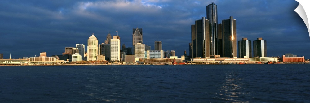 <p>Panoramic sunrise view of Renaissance Center, Detroit, MI</p>