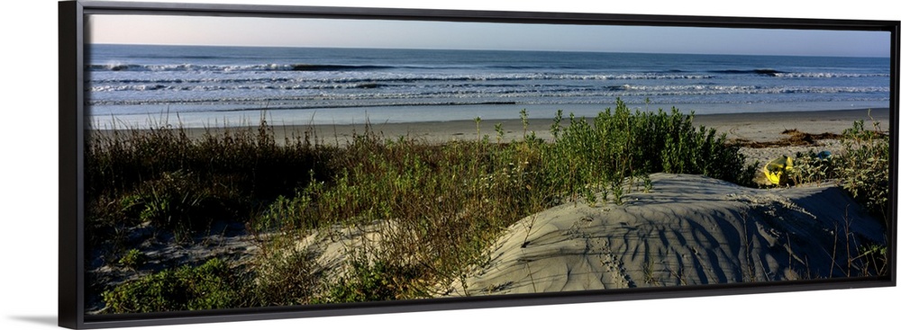 <p>Panoramic photograph taken from behind the dunes on a beach showing small waves in the ocean about to crash onto the sand.</p>