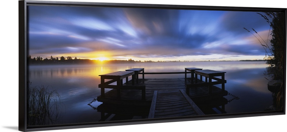 <p>Panoramic photograph f wooden dock at sunset with forest in distance under a cloudy sky.</p>