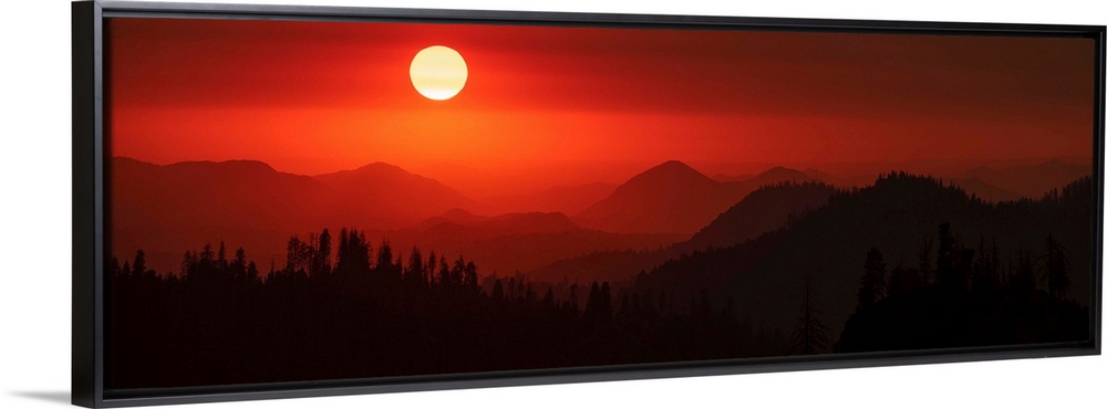 <p>Panoramic view of a darkened red sky in Sequoia National Park, California.</p>