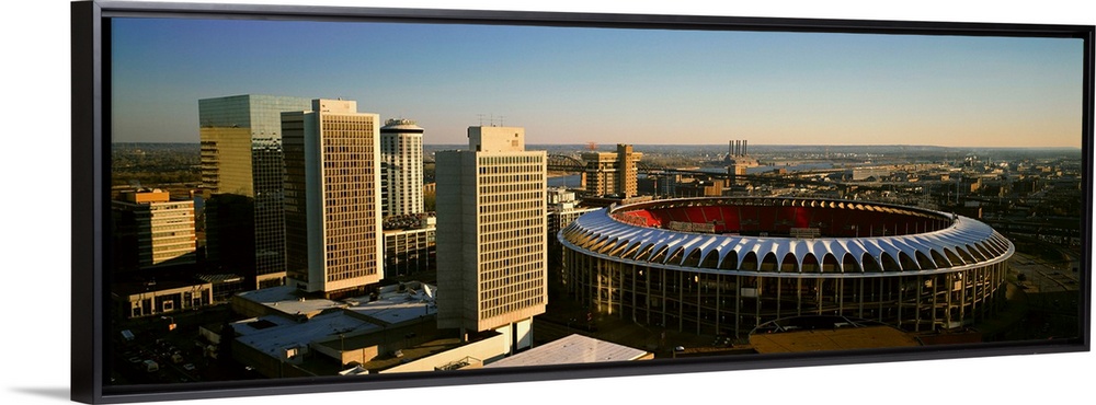 <p>Panoramic view of Busch Stadium and Kansas City skyline at sunset, MO</p>
