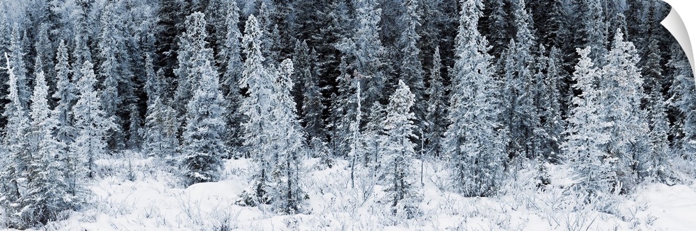<p>Giant landscape photograph of a line of spruce trees covered in frost, surrounded by a snowy landscape in Chugach State Park, near Eagle River in Southcentral, Alaska.</p>