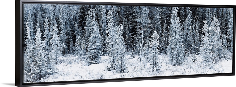<p>Giant landscape photograph of a line of spruce trees covered in frost, surrounded by a snowy landscape in Chugach State Park, near Eagle River in Southcentral, Alaska.</p>