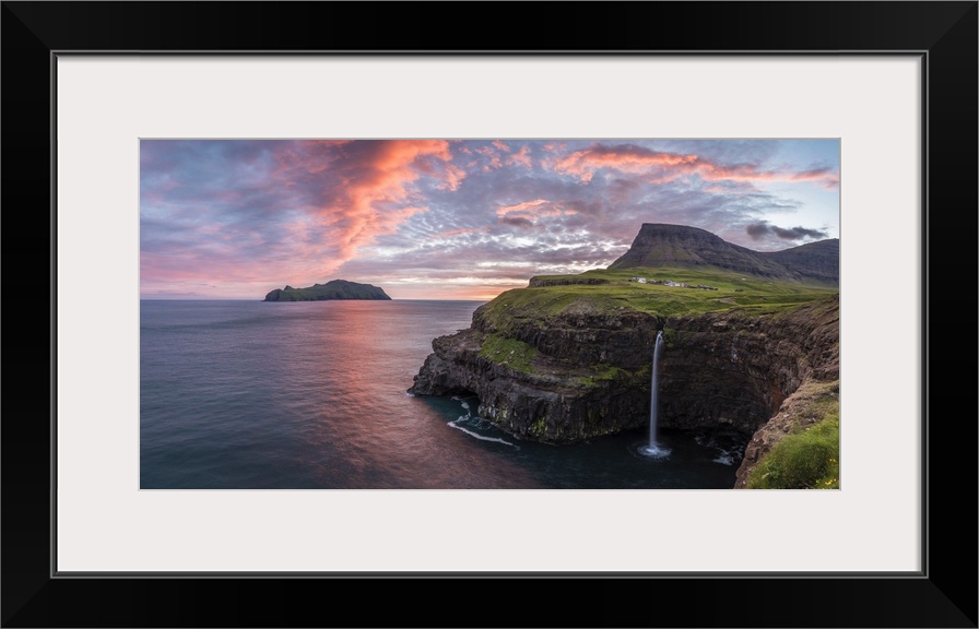 <p>Gasadalur, Vagar island, Faroe Islands, Denmark. Panoramic view of Mykines and the iconic waterfall jumping from the cliff into the ocean at sunset.</p>