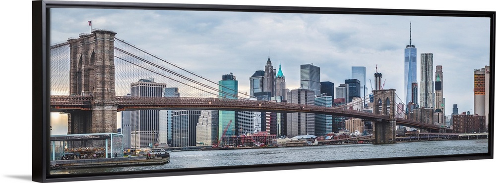 <p>Panoramic view of New York city skyline with the Brooklyn Bridge.</p>