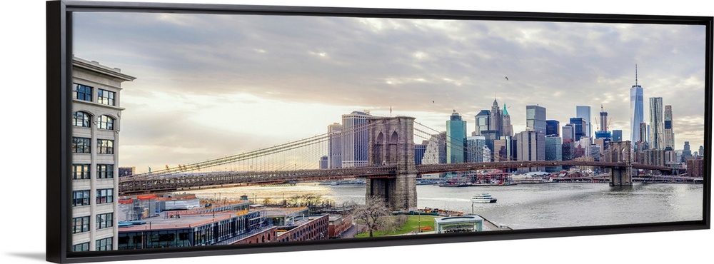 <p>Panoramic view of the Brooklyn Bridge in New York from the east side with the sun shining through clouds.</p>