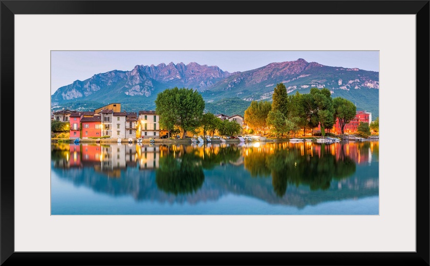 <p>Lecco, Lombardy, Italy. Panoramic view of the colorful houses and the Mount Resegone reflected onto the river in Pescarenico district at dusk.</p>