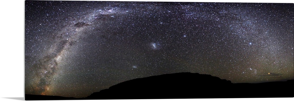 <p>The Milky Way in a panoramic photograph from Scorpius to Orion at the Somuncura Plateau in Argentina. The Magellanic Clouds can be seen inside the arch formed by our own galaxy.</p>