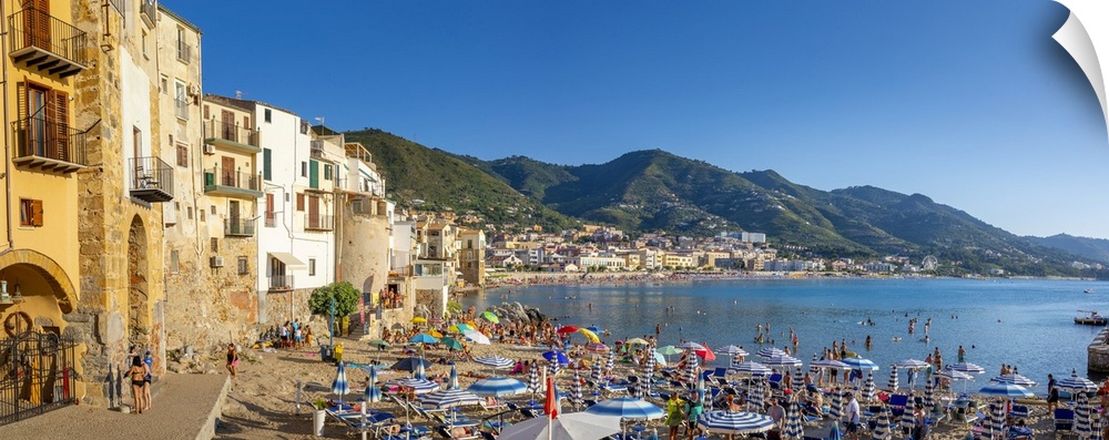 <p>Panoramic view of tourists on beach, mountains in background, Cefalu, Province of Palermo, Sicily, Italy, Mediterranean, Europe</p>