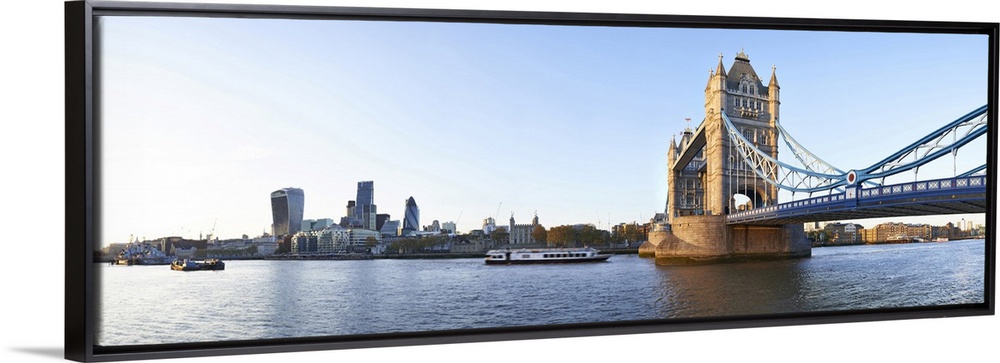<p>Panoramic view of Tower bridge from Canary Wharf to the city from south bank of the river Thames.</p>