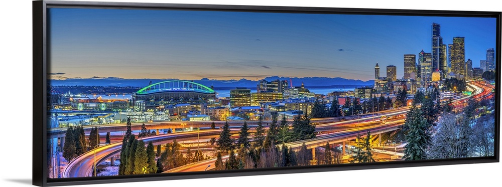 <p>Panoramic view over Downtown skyline with Interstate 5 at twilight, Seattle, Washington, USA.</p>