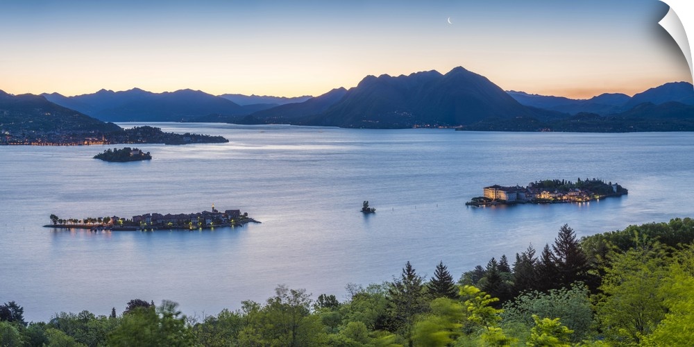 <p>Borromean Islands, Stresa, Lake Maggiore, Verbano-Cusio-Ossola, Piedmont, Italy. Panoramic view over the isles at dawn with moon.</p>