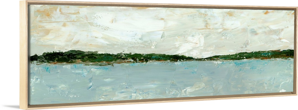 <p>A long, panoramic abstract of a lake or ocean scene, with stormy blue waters under a cloudy sky. Painted in a chunky, abstract style, this image would compliment both a traditional or contemporary docor style.</p>