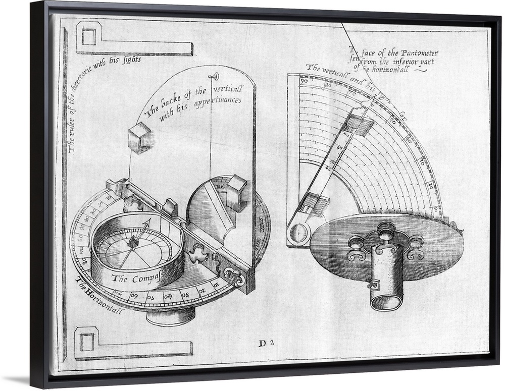 <p>Pantometer. 16th century engraving showing the design of a pantometer. This is used to determine the bearing and elevation to a given point. The base plate is turned to align with the object and the bearing read from a compass. A sighting bar is then raised to determine the elevation. This engraving was first published in The Navigator's Supply by William Barlowe, printed at London in 1597.</p>