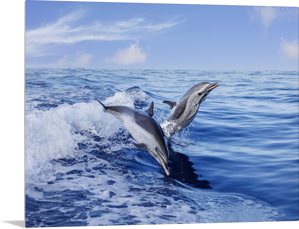 <p>Pantropical spotted dolphins (stenella attenuata) leap out of the open ocean, Hawaii, united states of America.</p>
