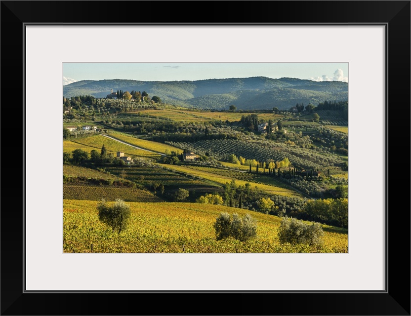 <p>View of valley of Panzano in Chianti, patterned lines of vineyards, cypresses and olive trees with farmhouses, Tuscany, Italy, Europe</p>