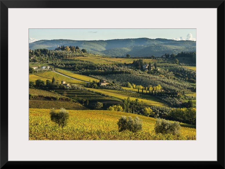 <p>View of valley of Panzano in Chianti, patterned lines of vineyards, cypresses and olive trees with farmhouses, Tuscany, Italy, Europe</p>