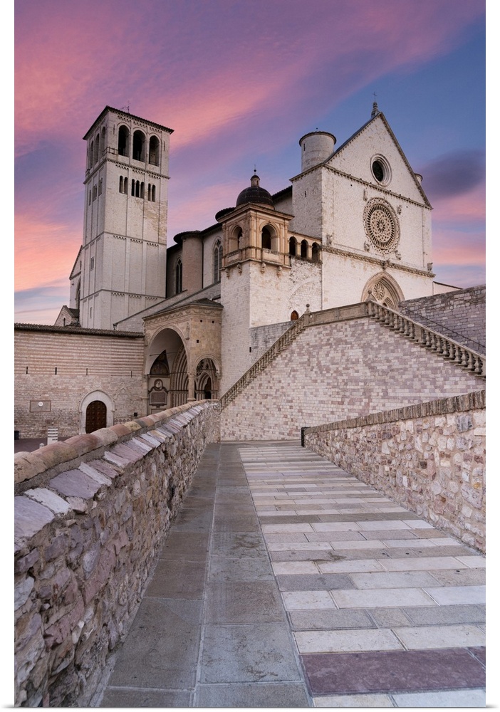 <p>Pink sunrise over the Papal Basilica of Saint Francis in Assisi, UNESCO World Heritage Site, Perugia province, Umbria, Italy, Europe</p>