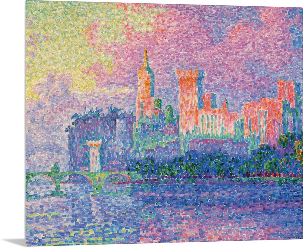 <p>The Papal Palace at Avignon, by Paul Signac, 1909, 20th Century, oil on canvas, cm 73,5 x 92,5 - France, Ile de France, Paris, Muse dOrsay, RF1977-323. All. The Papal Palace at Avignon port yellow green azure light blue bank water waves tower clouds pink</p>