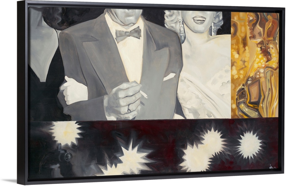 <p>Painting depicts a glamorous Hollywood event with a tuxedo-clad man, two women in formal gowns (one resembling Marilyn Monroe), and an abstract Oscar statue, all under the intense glare of paparazzi flashes.</p>