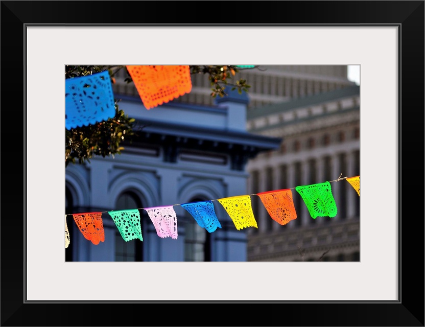 <p>Papel picado banners strung around the Plaza del Pueblo de Los Angeles near Olvera Street for Cinco de Mayo.</p>