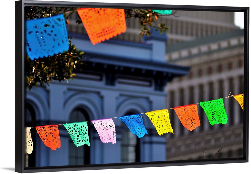 <p>Papel picado banners strung around the Plaza del Pueblo de Los Angeles near Olvera Street for Cinco de Mayo.</p>