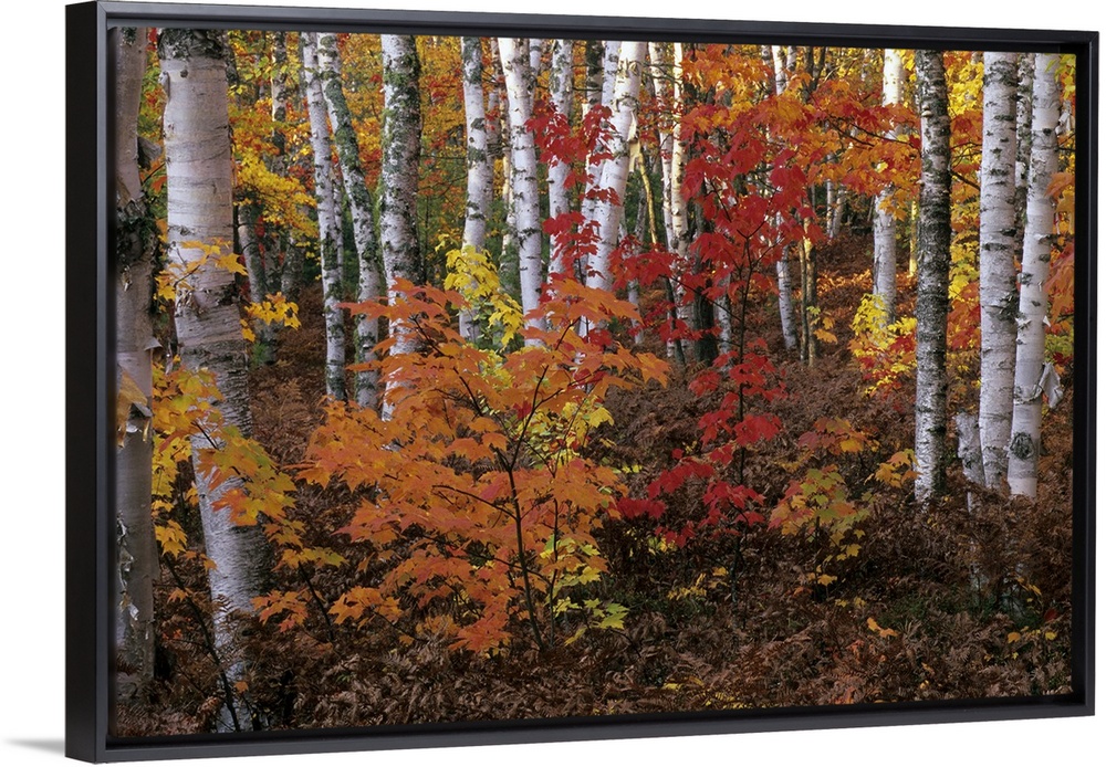 <p>Paper Birch & Red Maples in Autumn Colors, Pictured Rocks National Lakeshore, Upper Peninsula of Michigan. Paper or White Birch (Betula papyrifera), Red Maple (Acer rubrum). Red maple leaves turn red, orange and yellow.</p>