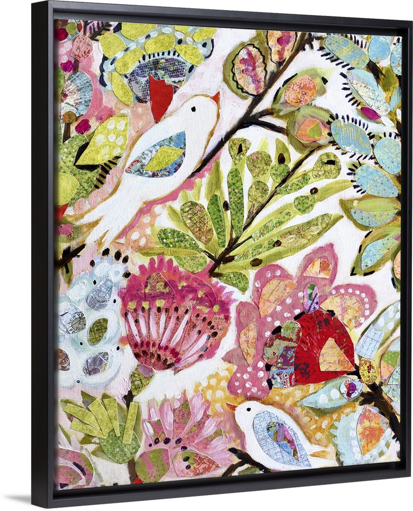 <p>Boho style artwork of white birds surrounded by colorful tropical flowers and leaves.</p>