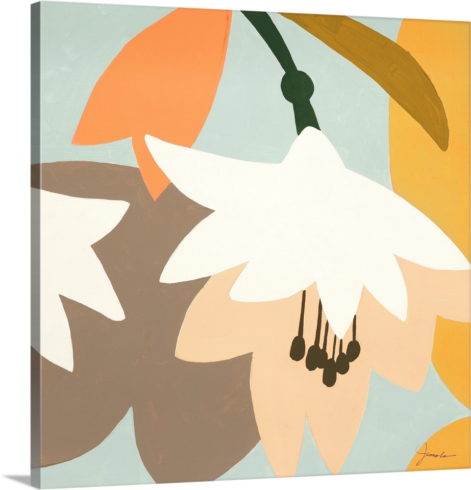 <p>Vibrant, stylized botanical art featuring a white flower with peach accents & dark stamens, set against a light blue background with abstract orange, brown, & yellow forms. Modern, clean aesthetic.</p>