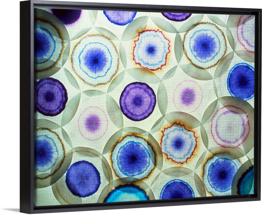 <p>Paper chromatography. A selection of paper chromatograms of industrial dyes. Paper chromatography involves placing a small amount of the substance under investigation on a piece of filter paper, then slowly dripping a solvent into the centre of the paper. The solvent then spreads out over the paper by capilliary action, carrying with it the components of the substance at differing rates. The distance travelled along the paper by each component during the time of the experiment is a measure of this characteristic transport rate and may be used to identify each component.</p>