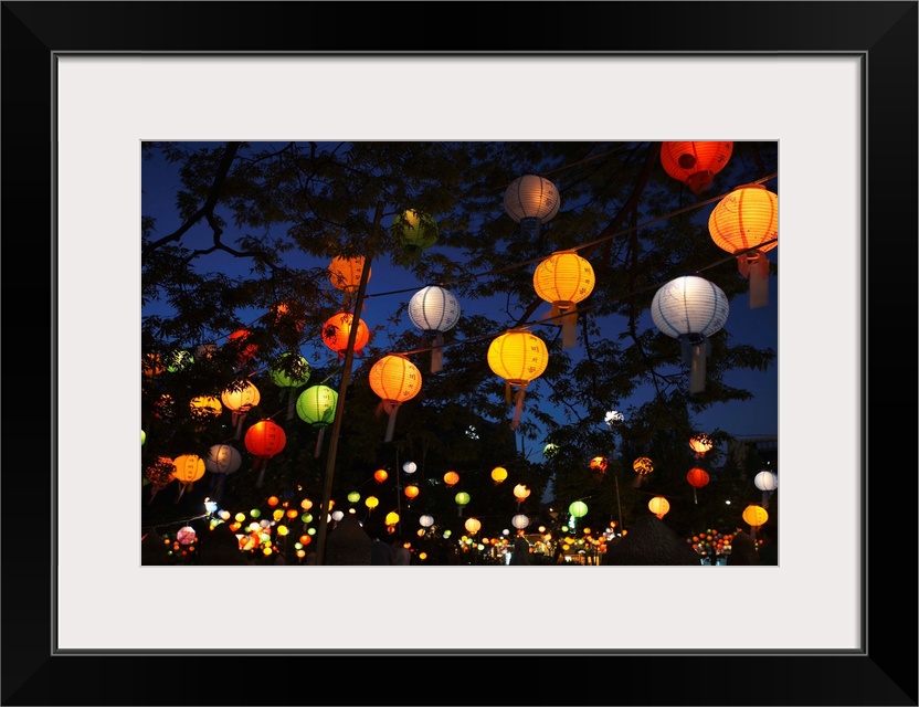 <p>Paper lanterns hanging from trees at dusk in Jangchung Park during festival marking Buddha's birthday.</p>