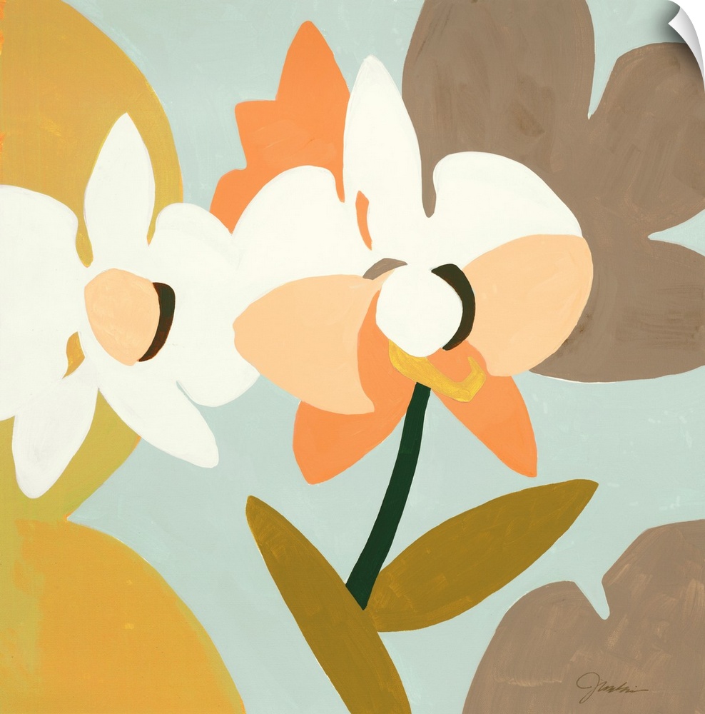 <p>Contemporary floral artwork featuring two stylized cream and peach flowers with dark centers, set against a light blue-green background with abstract mustard yellow and brown leaves. Modern, calm, and graphic.</p>