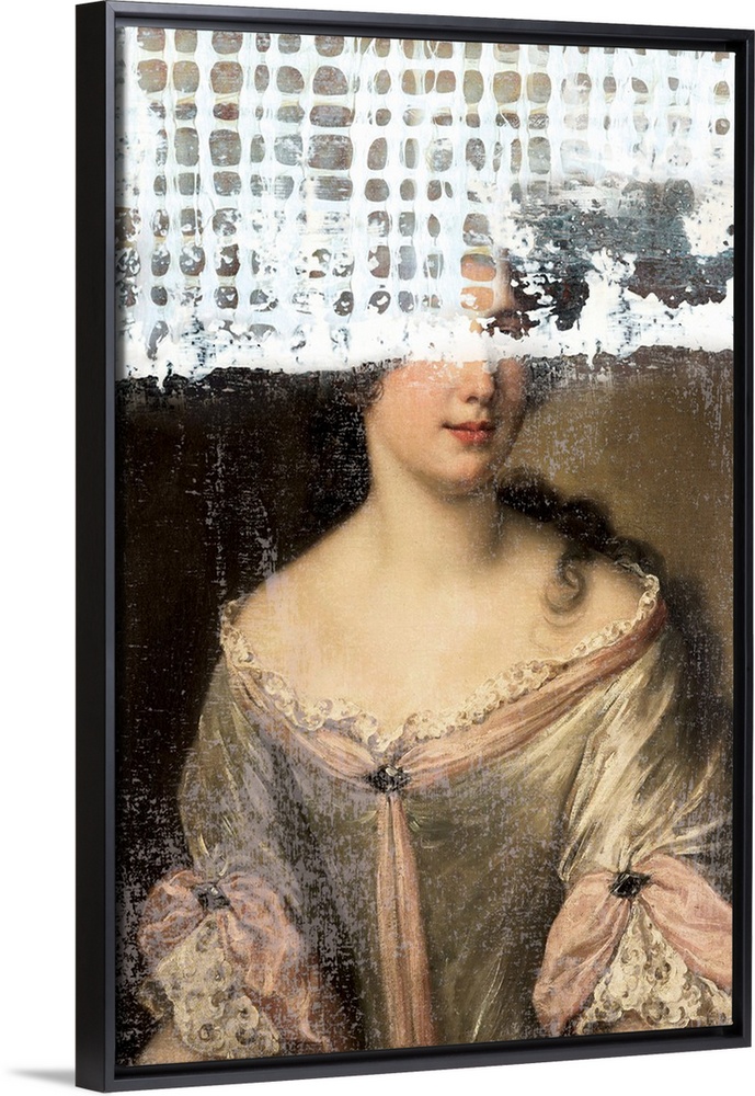 <p>A redesign of a classic portrait painting with a weaved white design overlapping the top on the image.</p>