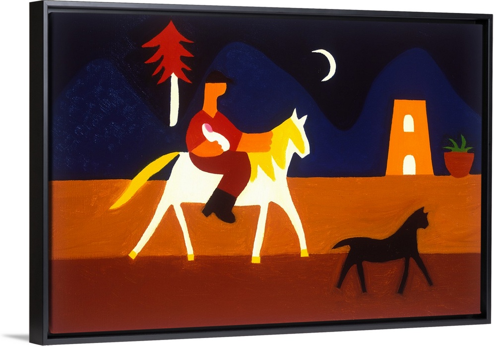 <p>Contemporary painting of a man with a baby riding a horse at night.</p>
