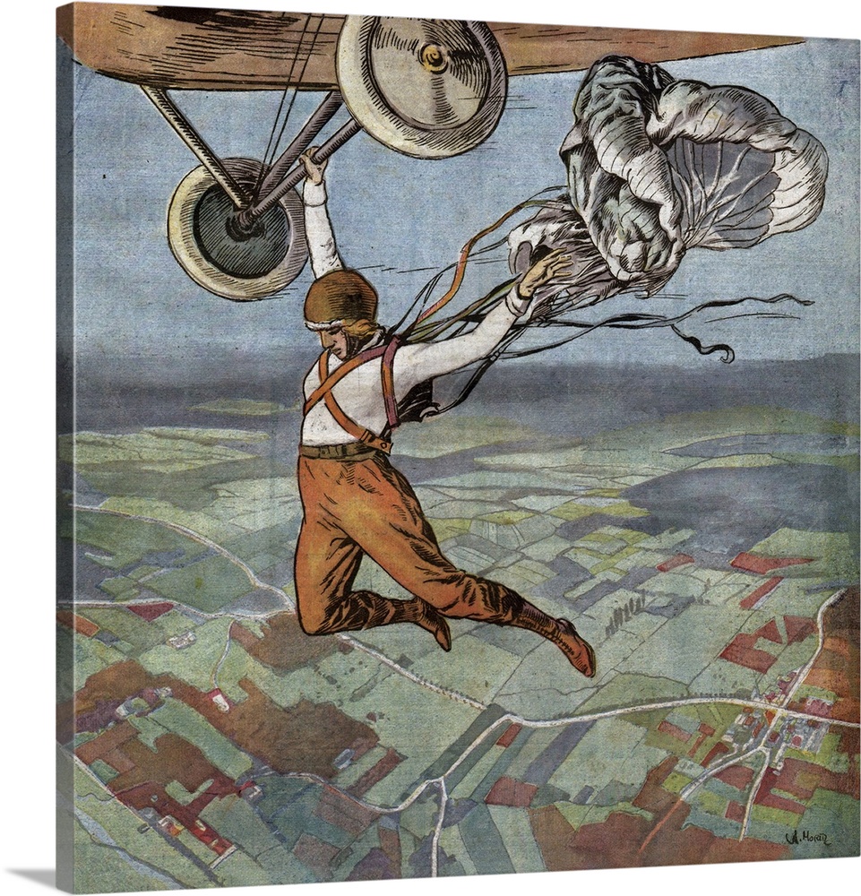 <p>Parachute jump, illustration. The aviator Denyse Collin testing a parachute under 300 meters. The plane is piloted by Alfred Fronval. Illustration in: Le Petit Journal, France, Nov, 25, 1923.</p>