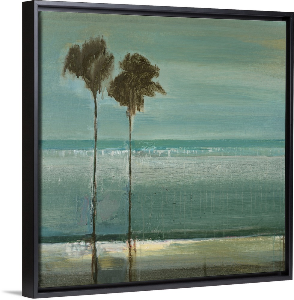 <p>A contemporary painting of two tall thin palm trees standing against a sea blue background.</p>