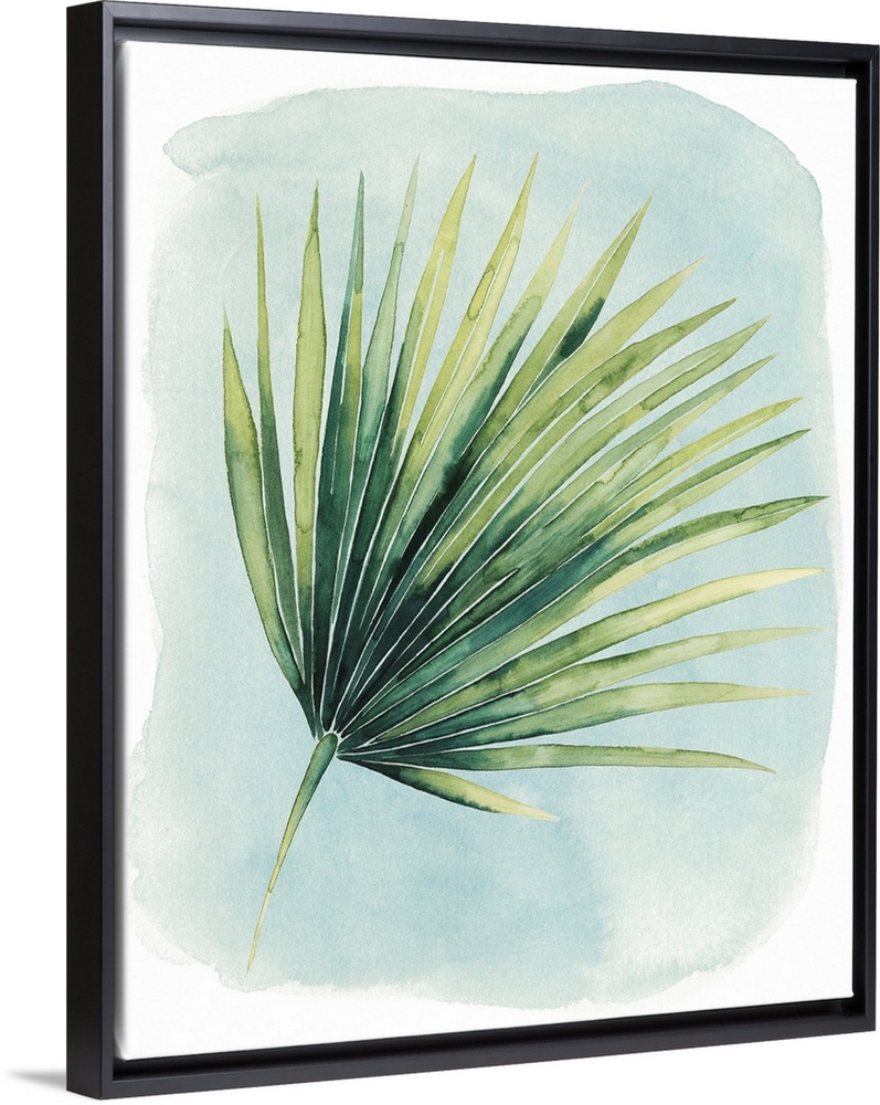 <p>Watercolor artwork of a broad green palm leaf on pale blue.</p>
