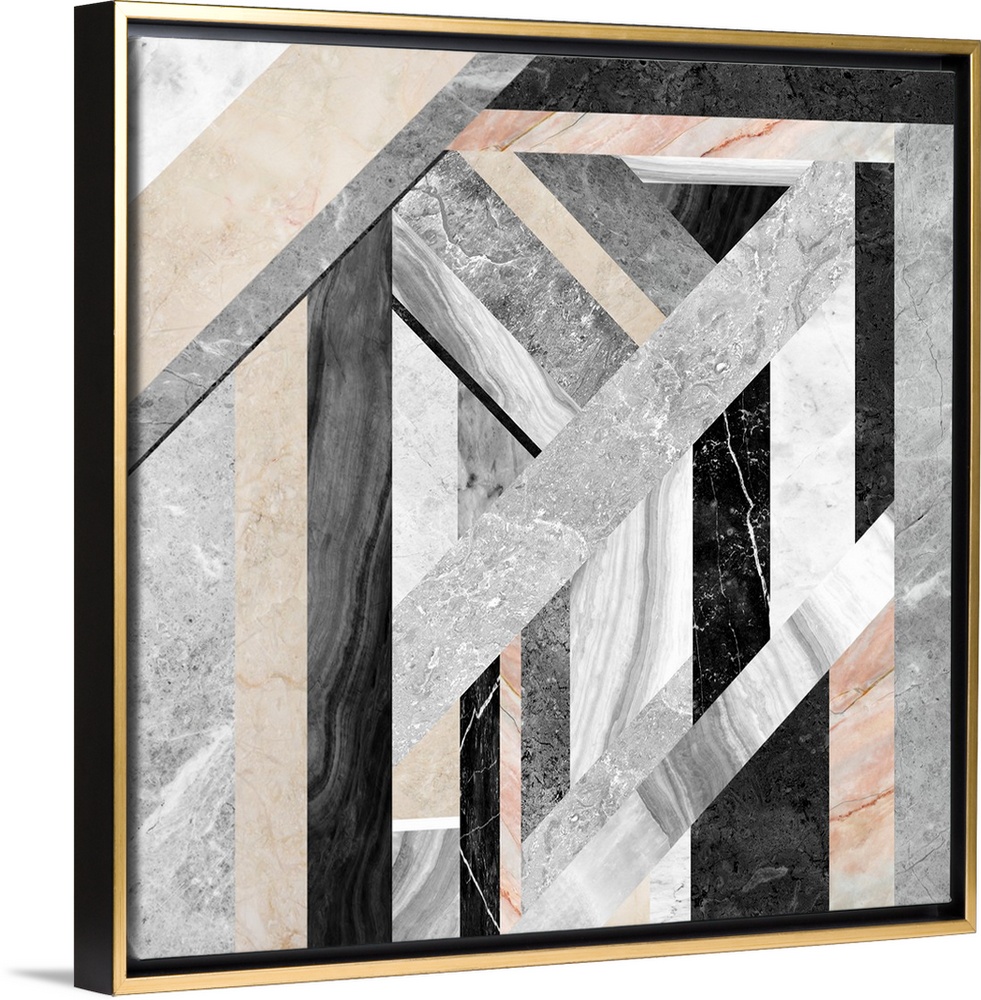 <p>Square modern painting of silver, black and beige lines, intersecting in varies directions, with a marble effect.</p>