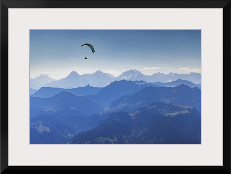 <p>Paraglider flying over Kander Valley with Jungfrau, Monch and Eiger mountains in the background, Canton of Bern, Switzerland</p>