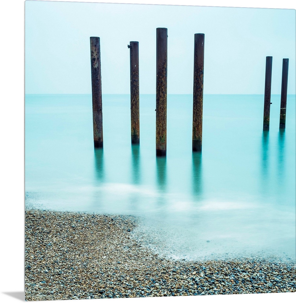 <p>A photograph of wooden poles from a pier sticking up from the water along a beach.</p>