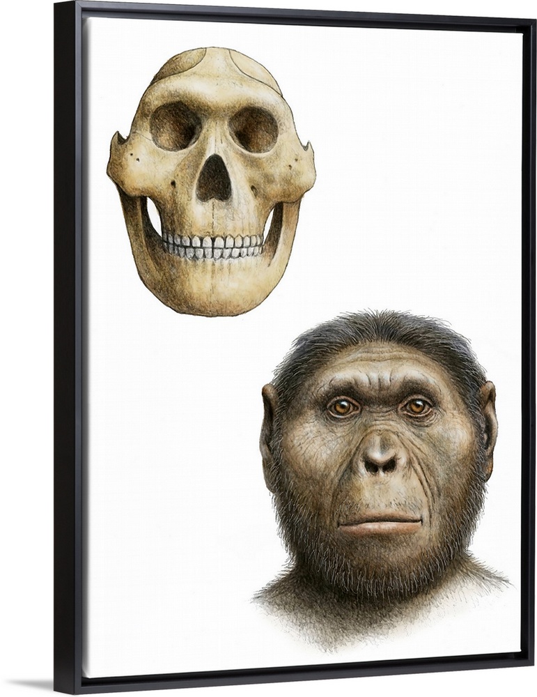 <p>Paranthropus robustus. Artist's impression of the skull and face of the early hominid Paranthropus robustus. P. robustus means \robust equal of man\ and the name is sometimes used interchangeably with Australopithecus robustus. P. robustus had a long, broad flattish face with facial buttressing and a powerful lower jaw. It was heavily built and its diet included vegetarian food. This species lived from 2.2 to 1 million years ago.</p>
