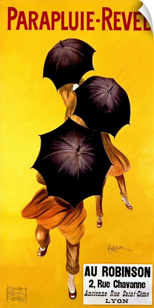 <p>Vertical, big vintage advertisement of Parapluie Revel, three people dancing in the rain, their faces hidden by open umbrellas. French text at the bottom of the image.</p>