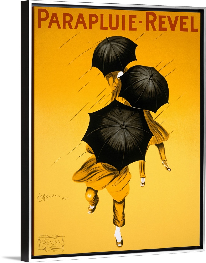 <p>Big vintage art shows three women with umbrellas in the rain of a Parapluie Revel advertisement.</p>