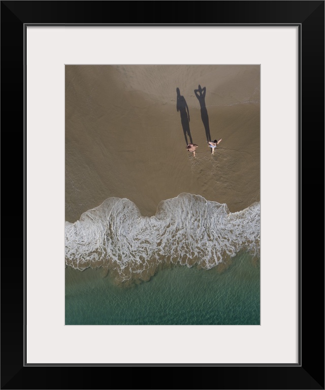 <p>An artistic photograph of an aerial view of two people on a beach casting long shadows.</p>