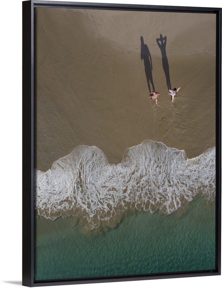 <p>An artistic photograph of an aerial view of two people on a beach casting long shadows.</p>