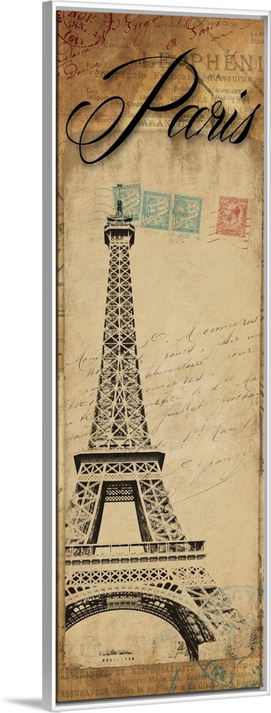 <p>Artwork of the Eiffel Tower against a postage patterned background. With "Paris" at the top of the image.</p>