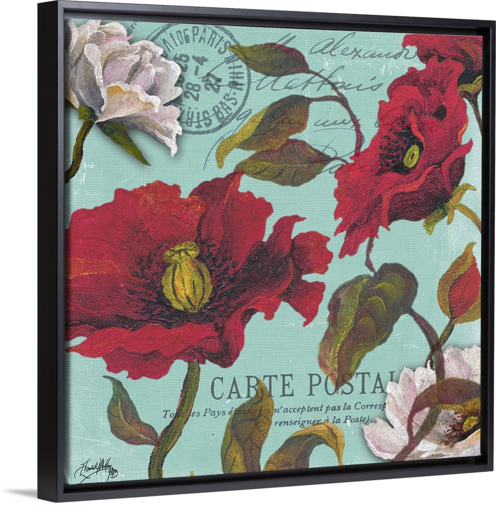 <p>A floral painting on an aqua colored French postcard background.</p>