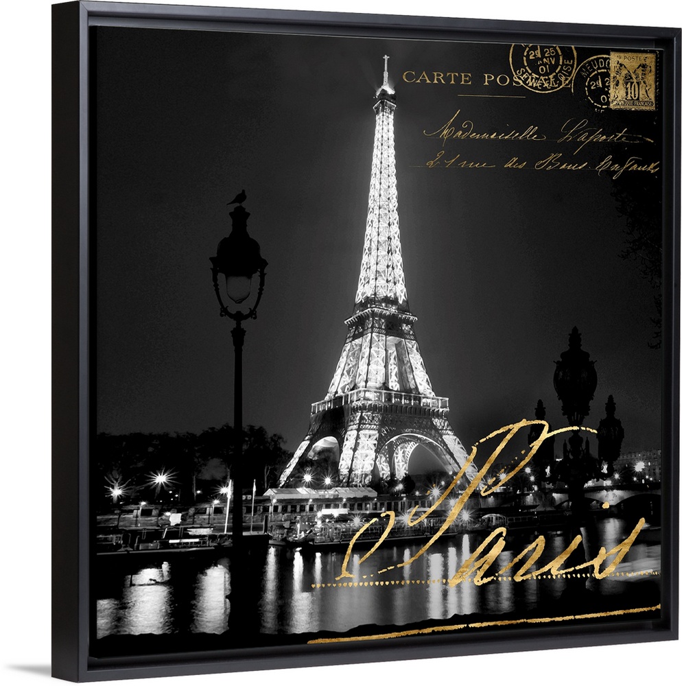 <p>Square decor of a black and white Eiifel Tower with the Seine river in the foreground and metallic gold writing on top.</p>
