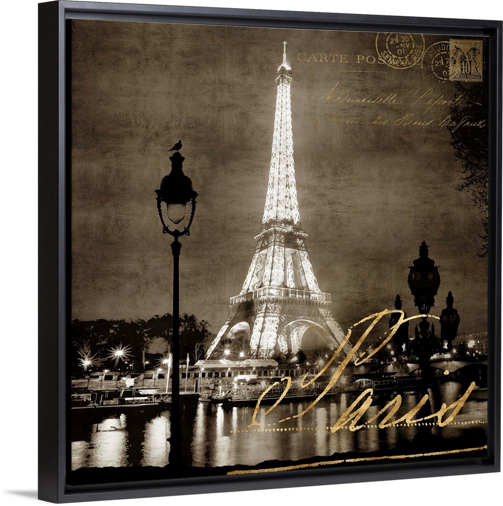 <p>Square decor of a sepia toned Eiifel Tower with the Seine river in the foreground and metallic gold writing on top.</p>
