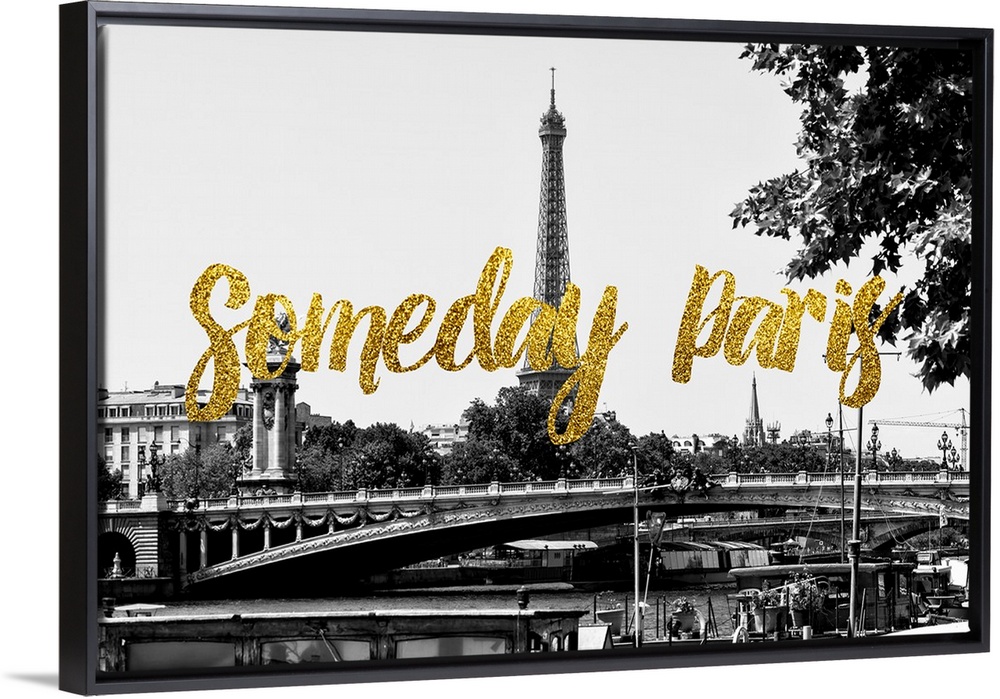 <p>Black and white photograph of a bridge in Paris, France with the Eiffel Tower in the background and the phrase "Someday Paris" written in gold glitter. From the Paris Fashion Series.</p>